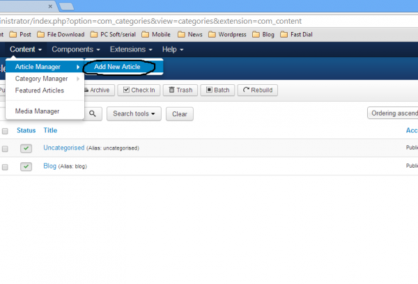 যাহোক নিছের ছবির মতো Content মেনু থেকে Article Manager এবং Add new Article এ ক্লিক করুণ।