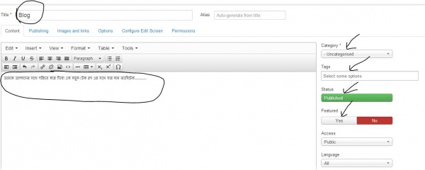 এখন টাইটেল এ একটা বিষয় বা আর্টিকেল এর নাম দিন যেমন আমি দিয়েছি Blog content এর জায়গায় আপনি যে বিষয় এ লিখতে চান সেটার বিস্তারিত লিখুন। category থেকে আপনার বিষয় সম্পর্কিত একটা ক্যাটেগরি সিলেক্ট করুণ আপনার আর্টিকেল বিষয় সম্পর্কিত কিছু শব্দ লিখুন ট্যাগ এর জায়গায়।