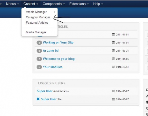 কি করে ক্যাটেগরি তৈরি করবেন নিছের ছবির দিকে খেয়াল করুণ। প্রথমে Content মেনু থেকে Category Manager এবং Add new category তে ক্লিক করুণ।