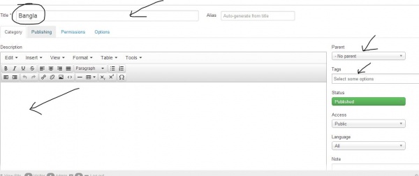 আর বাকি অপশন গুলো আগের টিউন এ আলোচনা করা হয়েছে। সব কাজ হলে Save এ ক্লিক করুণ। সকল ক্যাটেগরি দেখতে Content মেনু থেকে Category Manager এ ক্লিক করুণ।