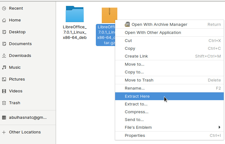 ডাউনলোড করে নেওয়ার পর, যেখানে ডাউনলোড হয়েছে সেখানে যান। deb.tar.gz ফোল্ডারটি উপর মাউস পয়েন্টার রেখে মাউসের রাইট বাটন চাপুন, পপআপ উইন্ডো আসলে, স্ক্রল করে Extract Here এ ক্লিক করুন।
