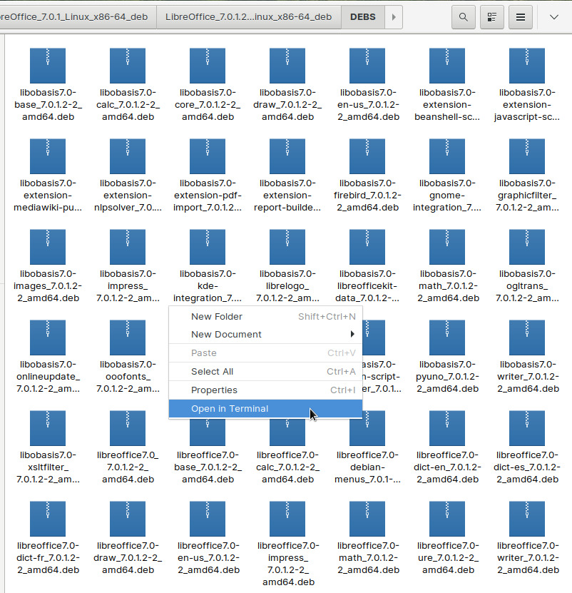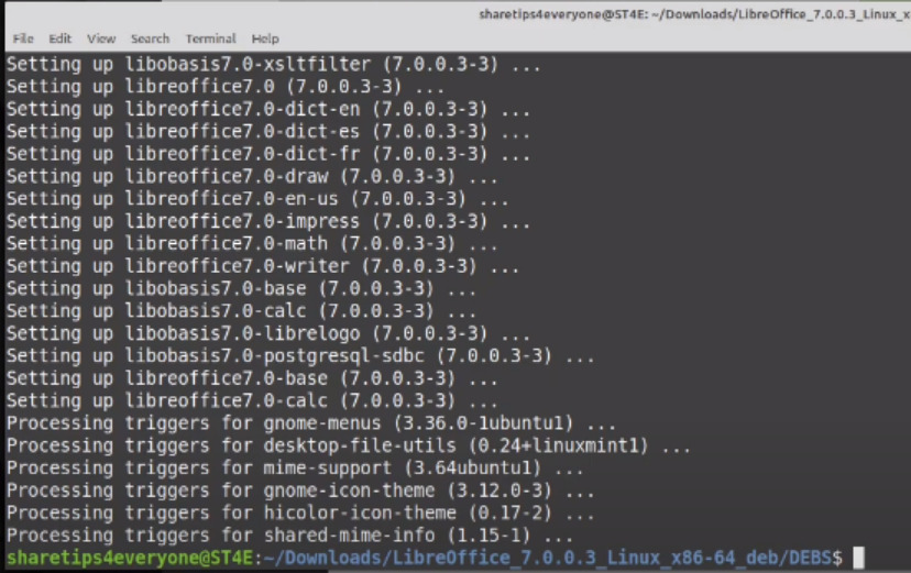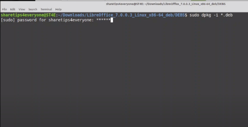 টার্মিনাল ওপেন হওয়ার পর নিচের এই কোডটি কপি করে টার্মিনালে পেষ্ট করুন। টার্মিনালে পাসওয়ার্ড চাইবে, পাসওয়ার্ড টাইপ করুন sudo dpkg-i *.debLibreoffice 7 ইনষ্টল হওয়ার জন্য কাজ চলতে শুরু করবে, অপেক্ষা করুন। ইনষ্টল হয়ে গেলে টার্মিনাল ক্লোজ করুন।