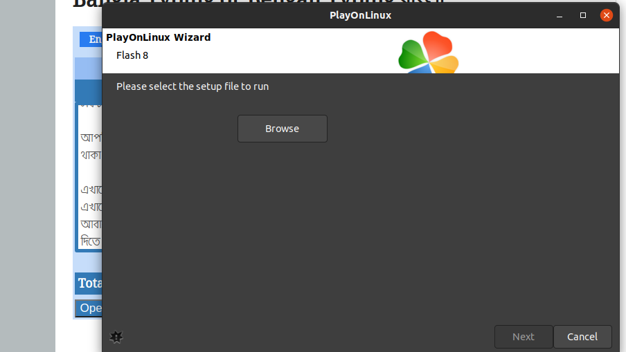 যদি কোনো সফটওয়্যার ইনস্টল করার সময় উপরের মতো আসে তাহলে আপনাকে সফটওয়্যারটি ডাউনলোড করতে হবে। তার জন্য গুগল এ গিয়ে সার্চ দিয়ে সফটওয়্যার টি ডাউনলোড করে নিন। তারপর browse বাটনে ক্লিক করে ডাউনলোড করা ফাইলটি দেখিয়ে দিন। তাহলে দেখবেন অটোমেটিক সফটওয়্যার টি ইনস্টল হওয়া শুরু করবে। ইনস্টল হয়ে গেলে playOnLinux সফটওয়্যারটির মাধ্যমে ইনস্টল করা সফটওয়্যারটি রান করতে পারবেন।