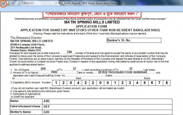 Print Reports: যদি প্রিন্টার ইন্সটল করা থাকে Print কমান্ডের মাধ্যমে এন্ট্রিকৃত BO ডাটা এবং ইস্যুয়ার কোম্পানীর ডাটা IPO আবেদন ফর্মে প্রিন্ট হতে থাকবে A4 সাইজ পেপারে।