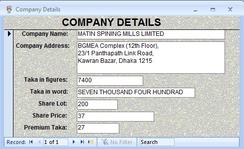 এই ফর্মে শেয়ার ইস্যুয়ার কোম্পানীর Name, Address, Total Amount, Amount in words, Share Lot, Per Share Price and Premium টাইপ করতে হবে। Premium যদি থাকে ঐ Amount টাই টাইপ করতে হবে, না থাকলে Premium এর ঘরে 0.00 বসিয়ে দিতে হবে। এই ফর্মে শুধুমাত্র একটি ইস্যুয়ার কোম্পানীর রেকর্ড Add করতে হবে। পরবর্তীতে আরেকটা IPO আসলে বর্তমান ইনফরমেশন গুলো ডিলিট করে দিয়ে নতুন ইস্যুয়ার কোম্পানীর ইনফরমেশনগুলো টাইপ করতে হবে।