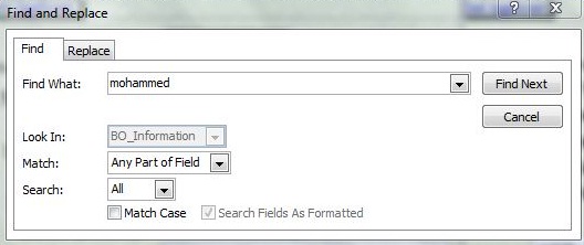 আপনি Find What এ যে ইনফরমেশনটা সার্চ করার দরকার সেইটা দিবেন এবং Match এ Any Part of Field সিলেক্ট করে দিয়ে Find Next এ ক্লিক করলে Database থেকে নিদির্ষ্ট ইনফরমেশনটা পেয়ে যাবেন।