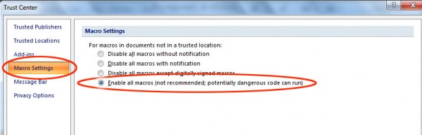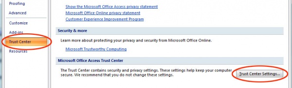 Click Office Button - Access Options - Trust centre - Trust centre settings