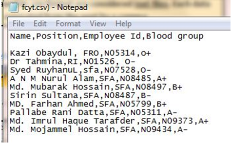 আগের পর্বে কিভাবে ডেটাবেইজ তৈরি করতে হয়,তার একটা ধারণা দিয়েছিলাম।পরবর্তিতে কিভাবে টেবিলে ডেটা ইনপুট দিতে হয়,ইনপুট দেয়ার ক্ষেত্রে কিভাবে বিভিন্ন কন্ডিশান দিতে হয়,তা শিখব।আজকে বিভিন্ন সোর্স থেকে কিভাবে বিভিন্ন ফরম্যট এর ডেটা Microsoft Access এ ইনপুট দিতে হয় তা শিখব।নীচে একটি টেক্সট ফাইলের নমুনা দেয়া হল।এটি নোটপ্যড এ তৈরি করা হয়েছে,এখন এটি আমরা এক্সেস এ ইনপুট দিব।এটা পারলে অন্যান্য বিভিন্ন ফরম্যট এর আর আলাদা করে বোঝার দরকার নাই,এতেই সব কভার হবে।