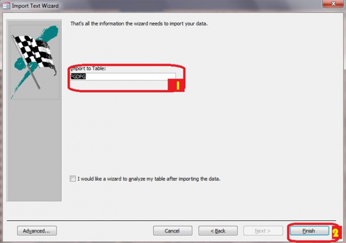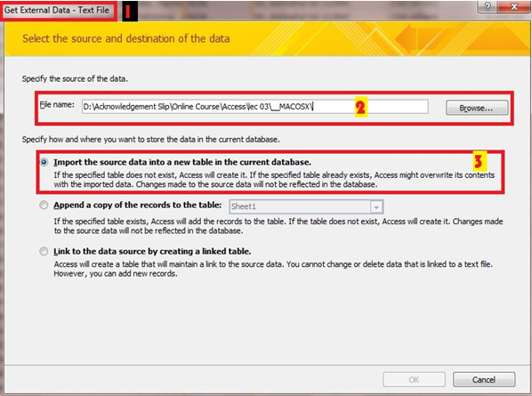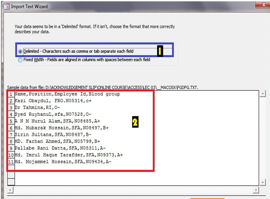 একটি কথা,text file বলতে .csv এক্সটেনশন দিয়ে সেইভ করা ফাইলকে বুঝায়।.csv বলতে বুঝায় comma separated value অর্থাৎ প্রতিটি ভ্যলু সে কমা দিয়ে আলাদা কর,এক্সেস যখন এইধরনের .csv ডেটা নিয়ে কাজ করে,তখন সে কমা কে ডিভাইডেশান লাইন হিসেবে চিন্তা করে ডেটা ইনপুট করে।Text file এ ক্লিক করার পর নিম্নোক্ত ছবির মত একটা উইন্ডো ওপেন হবে।window টির নাম হবে get external data-text file যা 1 নাম্বার দিয়ে মার্ক করা হয়েছে।