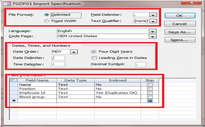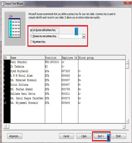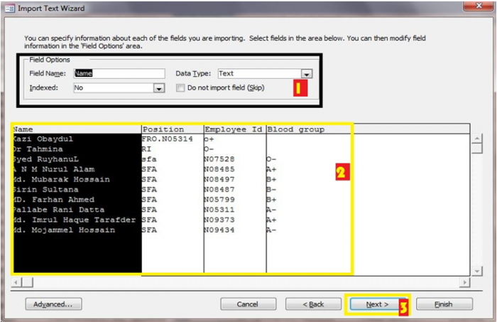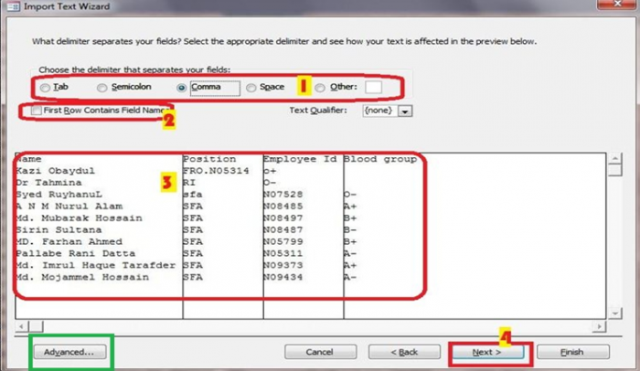 একটা গুরত্বপূর্ন ব্যপার খেয়াল রাখতে হবে,তা হল আমার Text file এ যদি প্রথম লাইন্টা ফিল্ড নামের হয়,এক্ষেত্রে ২ নাম্বার দিয়ে মার্কিং করা অংশটি চেক মার্ক করে দিতে হবে।এতে text file এর FIELD NAME টি নিজ থেকে এক্সেস ফাইলেও field name হিসেবে কাজ করবে।৩ নাম্বারে টেক্সট ডেটা টি কিভাবে বিন্যস্ত হল,তা দেখাচ্ছে।পরবর্তি অপঅশান এ যাবার জন্য ৪ এর next এ ক্লিক করা যায়।