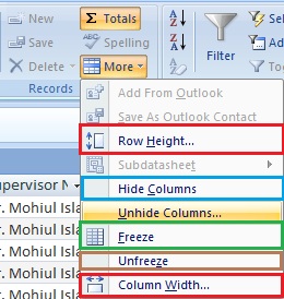 এটা এক্সেস এর অন্যতম গুরত্বপূর্ন আরেকটি টুলবার।More এ প্রেস করে Row height কিংবা Column width পরিবর্তন করা যায়,এছাড়াও কলাম hide/unhide,freeze/unfreeze করা যায়।