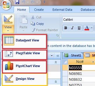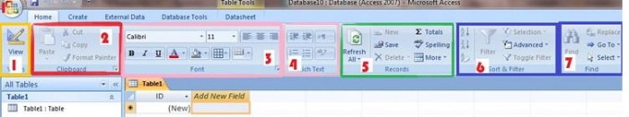 ১. View Tool:এই অংশটা একেবারেই আলাদা।এটা এক্সেল এবং ওয়ার্ড এর কোথাও খুজে পাওয়া যায় না। View আবার চারটা ভাগে ভাগ করা থাকে।Datasheet view টা মুলত ডেটা এন্ট্রি করার কাজে ব্যবহার করা হয়।এই ভিউ তে আসার পরে একেবারে উপরের দিকে তথা টপ রো তে ফিল্ডের নাম থাকে।আর সবার নীচের দিকে আছে Design view,এই টেবিলটা মুলত ডেটা প্রবেশের ক্ষেত্রে কিভাবে নানা কন্ডিশান এড করা যায়।Design View তে যত দক্ষতার সাথে কন্ডিশান এড করা যাবে,ডেটা এন্ট্রি তত বেশি পারফেক্ট হবে।Pivot table view এবং Pivot Chart View এক্সেল এর মতই একি কাজ করে থাকে।