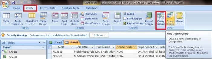 কুয়েরি ক্রিয়েট করার জন্য প্রথমে Create থেকে Query Wizard এ ক্লিক করতে হবে।