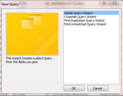 Query Wizard থেকে New QUERY নামের একটা ডায়ালগ বক্স আসবে,যেখানে সাধারনত Simple Query Wizard এ ক্লিক করে ok প্রেস করতে হবে।বাকি যা তিনটা আছে,এতে অস্থির হবার কিছু নাই,সে গুলো নিয়ে আমরা পরে বিস্তারিত আলাপ করব।
