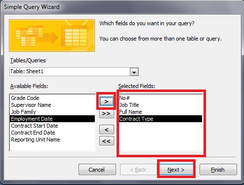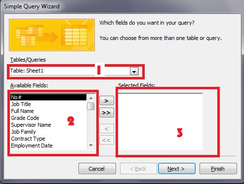 Simple query wizard নামে নতুন ডায়ালগ বক্স ওপেন হবে।এখানে মুলত তিনটি বক্স দেখা যাবে যা আমি বুঝার সুবিধার্থে নাম্বারিং করেছি।১ নাম্বারে Tables/Query তে আমি কোন টেবিল নিয়ে কাজ করব,তা নির্দিষ্ট করতে বলে।ড্রপডাউন থেকে তা সিলেক্ট করে নিতে হয়।টেবিল সিলেক্ট করার পর অই টেবিলে যেসব ফিল্ড থাকে তা ২ নাম্বার বক্স তথা available fields এ দেখাবে।পাশে যে তীর দেখা যায় তা দিয়ে পাশের বক্সে পাঠাতে হয়।যেগুলো দরকার সেগুলো সিলেক্ট করে arrow তে চেপে Selected fields বক্স এ পাঠাতে হয়।যদি কখোনো সবগুলো ফিল্ড প্রয়োজন হয় তবে ডাবল এরো প্রেস করতে হয়।সব শেষে নেক্সট বাটনে ক্লিক করতে হয়।