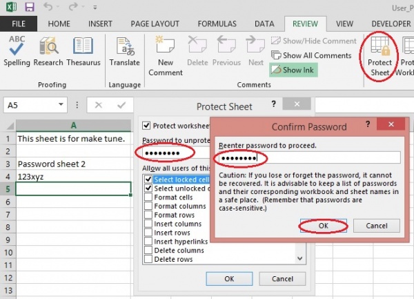 (৫) এবার Review tab এর changes group থেকে Protect Sheet এ click করি এবং অন্য আরেকটা password দিন। Confirm password এ same password দিন।