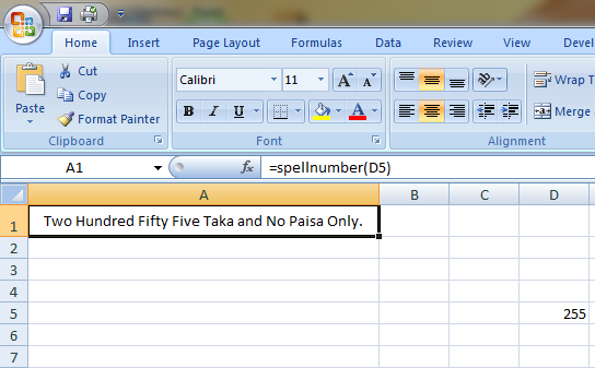 (৫) এখন যেকোন শীটে যেকোন সেলে Formula লিখি =spellnumber(d5)