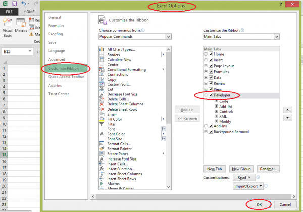 (২) এবার File --> Excel Option --> Customize Ribbon --> Main Tab থেকে Developer এ টিক দেই। OK Click করি।