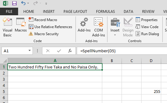 D5 সেলে যে সংখ্যা থাকবে সেই সংখ্যা কথায় প্রকাশ হবে। এভাবে আপনি যেকোন শীটে এই Formula ব্যবহার করতে পারেন।