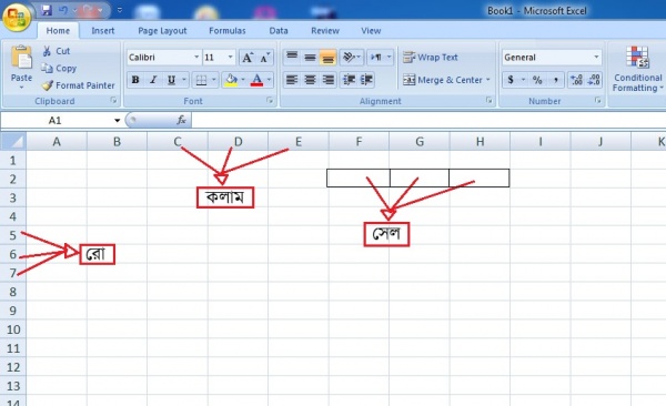 কলাম হল A,B,AA,AB, আর রো হল ১ থেকে শুরু করে ৬৫,৫৩৬ এবং স্তম্ভের সমন্বয়ে তৈরি হয় এক একটি ঘর (সেল)।