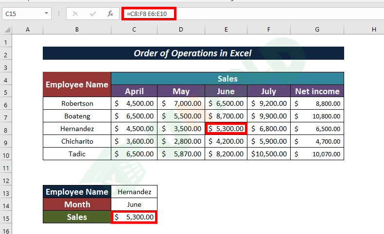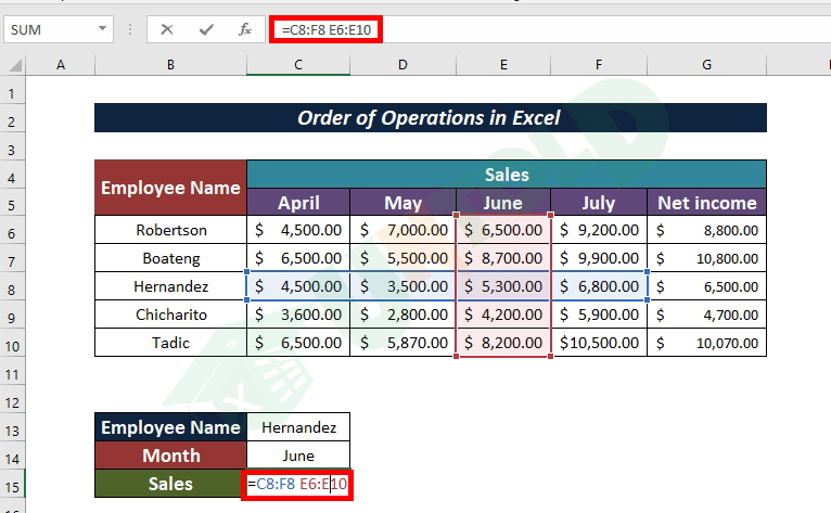 আমরা নিচের ইমেজে দেখতে পাচ্ছি, আমি জুন মাসে Hernandez এর সেলস ভ্যালু বের করতে চাচ্ছি। তাই, আমি জুন মাসের সেল এবং Hernandez এর সেলের ইন্টারসেক্ট ভ্যালু খুঁজে বের করেছি।