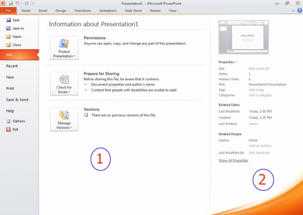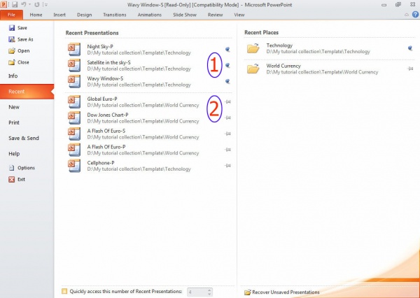 Recent: এখানে আপনার কাজ করা সাম্প্রতিক ফাইলগুলো তালিকা সুন্দরভাবে সাজানো থাকে ফাইলগুলো লোকেশান সহ। বামপাশে Recent presentation ডানপাশে Recent places তালিকা দেখুন নিম্নের ডায়ালগ বক্সে।
