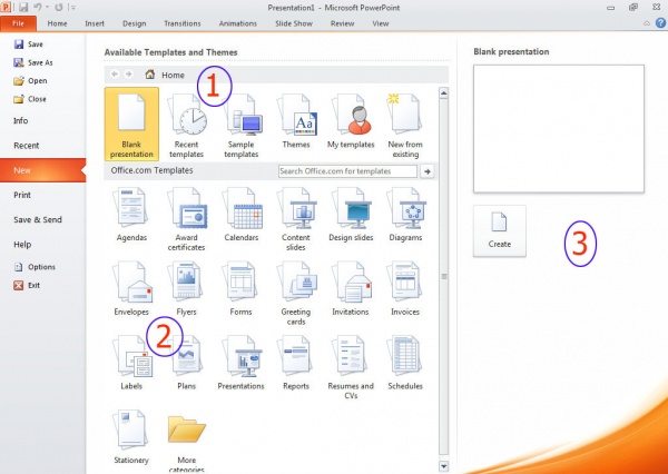 উপরের চিত্রে (১) চিহ্নিত স্থান থেকে Blank presentation select করে চিত্রে (৩) চিহ্নিত স্থানে Create এ ক্লিক করুন। নতুন ফাইল তৈরি হবে। এছাড়া Home এর অধীনে বিভিন্ন ডিফল্ট টেম্পলেট ব্যবহার করে আপনি কাজ করতে পারেন।