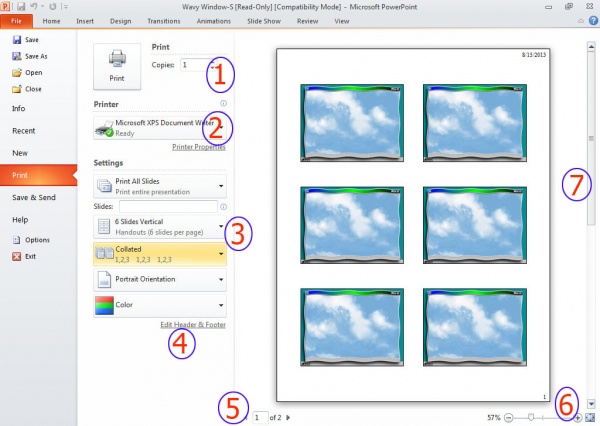 চিত্রে (৩) চিহ্নিত সেটিংস এ প্রথমেই কোন কোন স্লাইড প্রিন্ট করবেন তা সেট করুন। যদি সব স্লাইড প্রিন্ট না করেন তবে Slides অংশে স্লাইড নাম্বার সেট করতে পারেন এভাবে..১,৩,৪-৭, ১০, ১২, ১৬-২০।