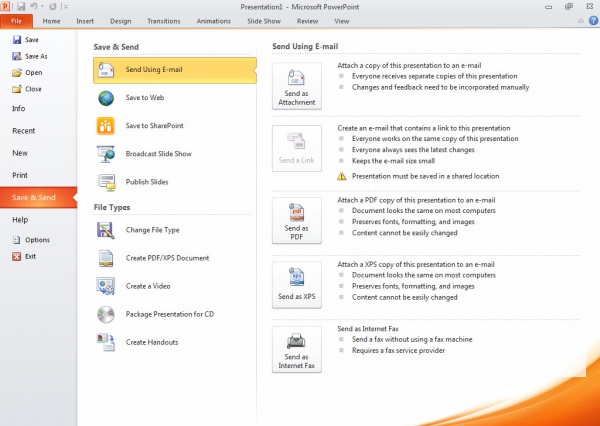 Save and send: এখান থেকে আপনি ফাইলটি অন্যান্য ফাইল ফরমেটে সেভ করতে পারেন। এমনটি পাওয়ারপয়েন্ট ফাইলটিকে ভিডিও ফাইলে পরিনত করতে পারেন, সিডির জন্য তৈরি করতে পারেন এবং ইমেইলে অন্যত্র পাঠাতে পারেন। Save and send এর বিভিন্ন অপশানে ক্লিক করলে ডানপাশে সাবমেনু তে আরো তথ্যসম্বলিত বিবরন পাবেন। সে অনুযায়ী কাজ করুন। নিচের চিত্রটি দেখুন।