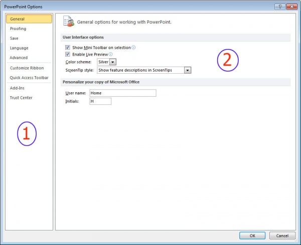 Options: এই ফিচারে মাইক্রোসফট পাওয়ারপয়েন্ট ২০১০ এর ইন্টারফেস ও সম্পূর্ন প্রোগ্রামটির কাস্টমাইজেশান প্রক্রিয়া দেয়া আছে।