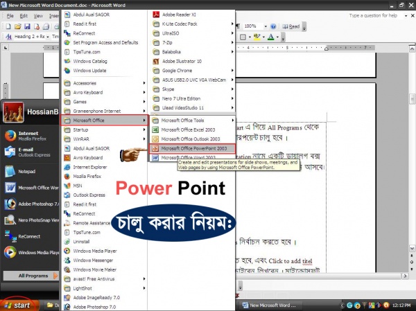 মাইক্রোসফট পাওয়ারপয়েন্ট চালু করার জন্য প্রথমে Start এ গিয়ে All Programs থেকে Microsoft powerPoint ক্লিক করলে মাইক্রোসফট পাওয়ারপয়েন্ট চালু হবে।