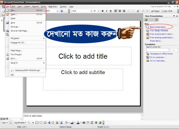 প্রথমে File থেকে New এ ক্লিক করলে New Presentation নামে একটি ডায়ালগ বক্স আসবে সেখান থেকে Blank Presentation এ ক্লিক করুন।