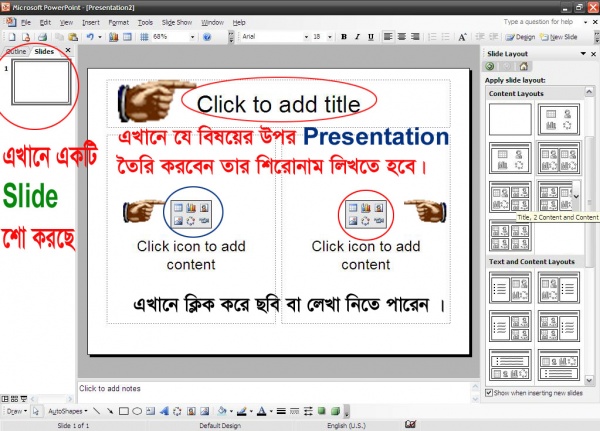 এবার Apply Slide Layout থেকে আপনার পছন্ত মত একটি Slide নিন যা দিয়ে আপনি একটি Presentation বানাবেন। নিচের দিকে ভালো করে খেয়াল করুন আর কাজ করুন।