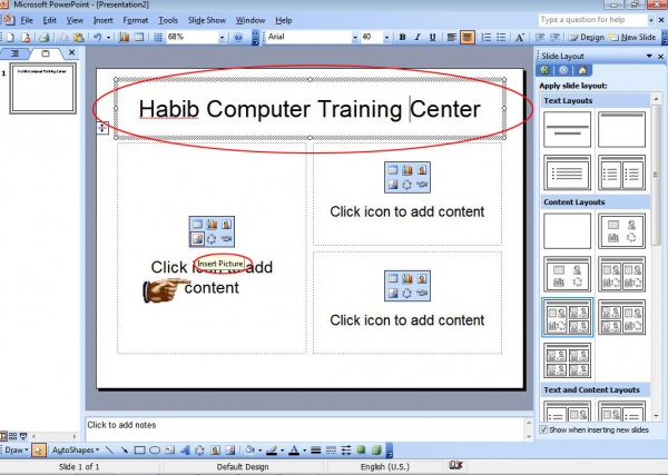 গত পর্বে আমরা Apply Slide Layout থেকে আমাদের পছন্দ মত একটি Slide নিয়ে ছিলাম আজ আমরা শিখব এই Slide কিভাবে ছবি/লেখা লিখতে হয় তার নিয়ম, তাহলে আসুন শিখে নিই।