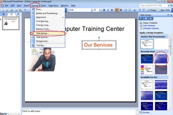 এখন আমরা সুন্দর এর জন্য একটি Design দিব, Designদিতে হলে Format মেনুতে ক্লিক করে Silde Design এ ক্লিক করে পছন্দ মত থিম (Themes) নির্বাচন করুন।
