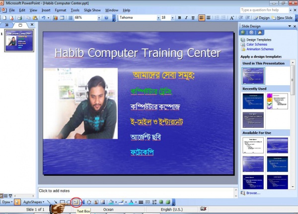 ৩। তারপর Drawing টুলবার থেকে Text Box সিলেক্ট করে একটি বক্স আঁকব, নিচের মত করে, তারপর যে কোন ফন্ট নির্বাচন করে বাংলা/ইংরেজী কিছু লেখা লিখুন, যে গুলো আপনি প্রেজেন্টশন এ দেখতে চান, আপনি চাইলে মাইক্রোসফট ওয়ার্ড এ লিখেও কপি করে এখানে পেস্ট করে দিতে পারবেন।