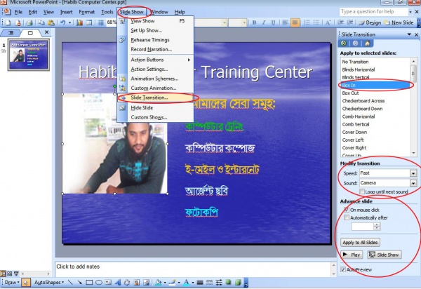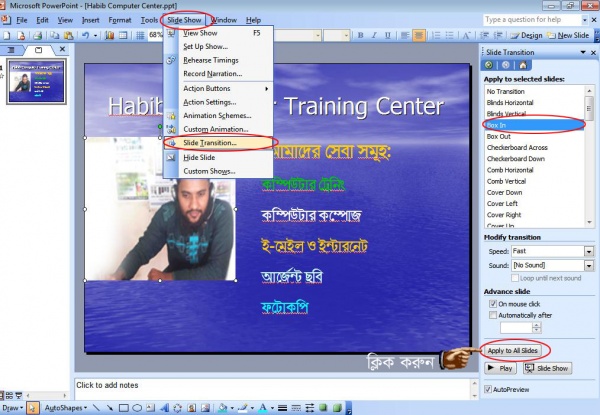 আমরা আমাদের আগের তৈরি করা স্লাইডে Animation দিব, দিতে হলে প্রথমেই আগের তৈরি স্লাইডটি Open করুন । তারপর Slide Show মেনুতে ক্লিক করে Slide Transition এ গিয়ে Transition to this slide থেকে যে কোন Animation সিলেক্ট করে। Apply to Slide বাটনে ক্লিক করুন, তাহলেই Slide Animation দেওয়া হয়ে যাবে।