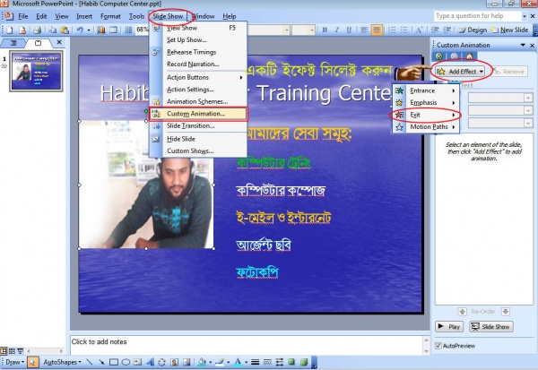 ২। স্লাইডে ছবিতে অথবা লেখাতে ইফেক্ট/এনিমেশন দেওয়ার নিয়মঃ প্রথমে ছবি অথবা লেখাকে সিলেক্ট করে Slide Show মেনুতে ক্লিক করে Custom Anamation বাটনে ক্লিক করে যে কোণ একটি ইফেক্ট সিকেক্ট করুন। নিচের মত করে।