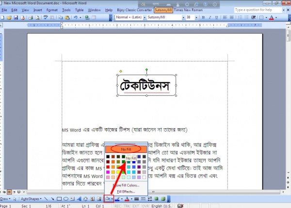 এবার দেখুন ফিল কালার দেওয়ার ফলে লেখা শো করছে না আপনি লেখাকে শো করতে হলে Drawing টুলবার থেকে Draw>Order> Send Behind Text এ ক্লিক করুন তাহলে লেখা শো করবে এভাবে আপনি যে কোন বক্স এর মধ্যে লেখার ডিজাইন করতে পারবেন সহজ ভাবে।