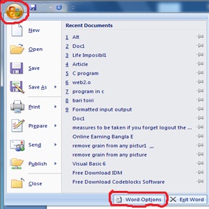 প্রথমে MS Word ফাইল খুলুন। তারপর উপরের বাম কোনায় দেখুন Office Button নামক একটি বাটন আছে সেখানে ক্লিক করুন তারপর নিচের দিকে খেয়াল করুন Word Options নামক আরেকটি বাতন আছে সেখানে ক্লিক করুন বুঝতে না পারলে নিচের ছবিটির সাহায্য নিন ।