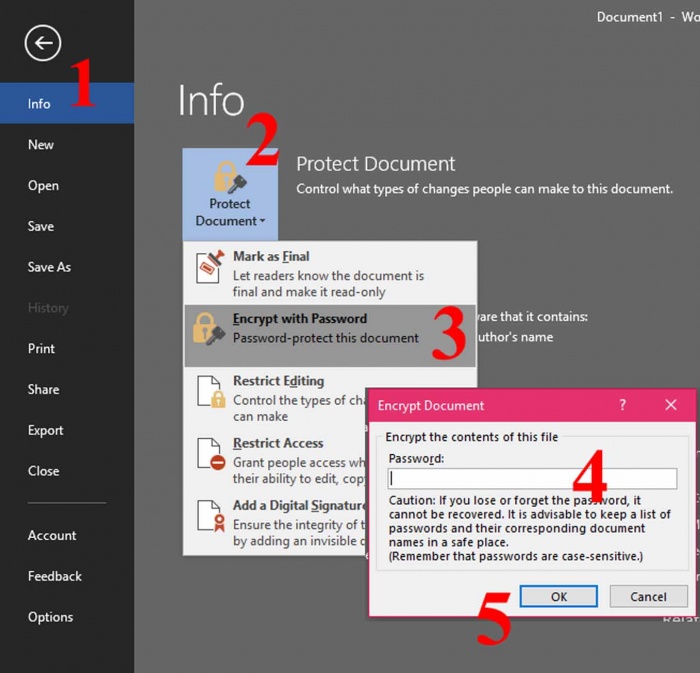 উপরের মেনুবার থেকে File+Info+Protect Document+Encrypt With Password+ ২বার পাসওয়ার্ড দিয়ে+Ok এবার ফাইলটিকে সেভ করলেই কাজ শেষ। এবার ক্লজ করে ওপেন করতে গেলেই পাসওয়ার্ড চাবে।