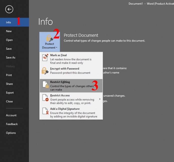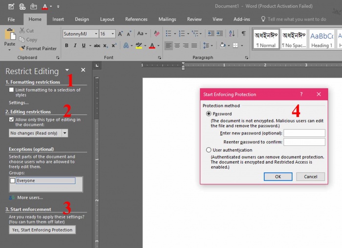 উপরের মেনু বার থেকে File+Info+Protect Document+Restrict Editing-এ ক্লিক।