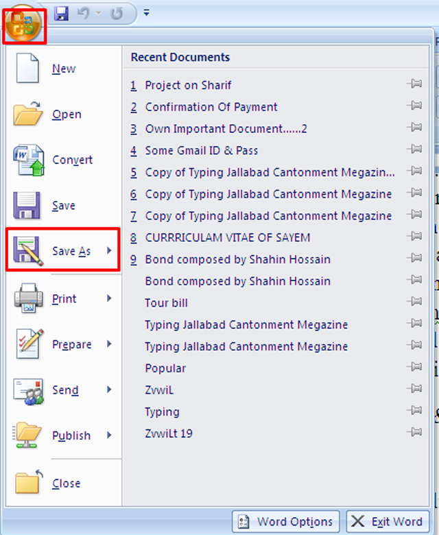 প্রথমে আপনি যে ডকুমেন্টসটি লক করতে চাইতেছেন সেটি ওপেন করেন। তারপর চিত্রের চিহ্নিত অফিস স্টার্ট বাটনে ক্লিক করে সেখান থেকে ফাইলটি সেভ আস করেন (নিচের চিত্রটি দেখুন)।