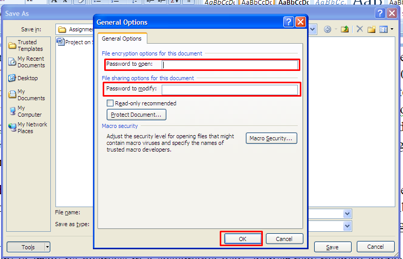 এরপর ৩নং চিত্রের মত একটি ডায়ালগ বক্স ওপেন হবে। সেখান থেকে Password to Open এবং Password to Modify ঘরে আপনার ইচ্ছামত পাসওয়ার্ড টাইপ করে OK-তে ক্লিক করেন। আপনারা চাইলে দুইটি ফিল্ডে দুই রকম পাসওয়ার্ড ব্যবহার করতে পারেন। ব্যাস কাজ শেষ। এখন দেখেন আপনার ডকুমেন্টসটি ওপেন করতে চাইলে পাসওয়ার্ড চাইতেছে।
