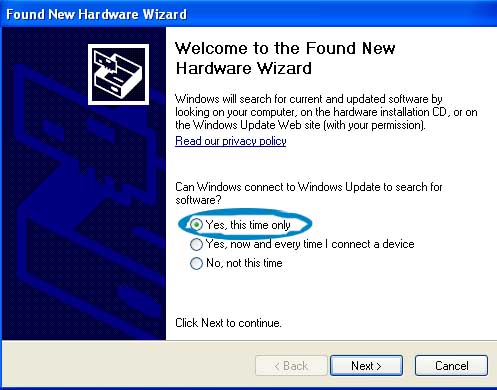 এরপর Found New Hardware Wizerd আসলে নিচের চিত্রের মত সিলেক্ট করুন Yes this time only এরপর Next এ ক্লিক করুন।