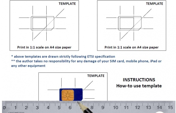 এখানে একটা পি ডি এফ ফাইল দেয়া আছে, A4 সাইজের প্রিন্ট করে নিতে হবে। কাগজের যেখানে সিমের নকশা দেয়া আছে, ঠিক সেখানে বসিয়ে ৫টি সরল রেখা বরাবর সমান সমান ভাবে পেন্সিল দিয়ে দাগ কেটে নিবেন। তারপর ধারালো কেঁচি দিয়ে দাগ বরাবর চারিদিক দিয়ে সিম কার্ড টি কেটে ফেলবেন। এই ভাবে মাইক্রো সিম তৈরি করা সম্ভব। তবে খুব খেয়াল রাখতে হবে প্রিন্টিংটা যাতে সমান মাপে হয়। পি ডি এফ ফাইলে একটা রুলারের আর ছবি দেয়া আছে, একটা রুলার নিয়ে ছবির রুলার এর মাপ (মিলি মিটার) ঠিক আছে কিনা মিলিয়ে নিতে পারেন।