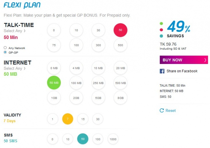 এখান থেকে আপনার যেটা দরকার সেটা সিলেক্ট করে Buy Now এ ক্লিক করুন। যেমন মিনিট কিনতে বা মেয়াদ বাড়াতে হলে টকটাইম ১০-৫০০ মিনিট পর্যন্ত যে কোন একটি সিলেক্ট করুন। এরপর ইন্টারনেট যদি চান তবে ৪ এমবি ৮ জিবি থেকে পর্যন্ত যে কোন একটি সিলেক্ট করুন।আর এসএমএস কিনতে না চাইলে ০ সিলেক্ট করুন। এরপর আপনার কাঙ্খিত মেয়াদ সর্বোচ্চ ৩০ দিন পর্যন্ত সিলেক্ট করুন। আপনি ইচ্ছে করলে যে কোন একটি সিলেক্ট (টকটাইম, ইন্টারনেট এবং এসএমএস) করে বাকীগুলো ০ সিলেক্ট করে দেখুন কত টাকা কাটা হবে দেখাচ্ছে। সিলেক্ট করা শেষ হলে Buy Now এ ক্লিক করুন।