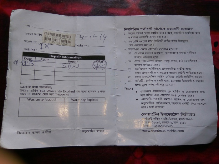 এর পর আমি ঢাকাতে ম্যাক্সিমাস অভিযোগ কেন্দ্রের সাথে যোগাযোগ করি (ফোন নং 01841717567) সে আমার কাছ থেকে সকল তথ্য নিয়ে আধা ঘন্টা পর ফোন করতে বলে আমি আধা ঘন্টা পরে ফোন করলে সে বলে আপনার সেট ল্যাবে আছে কাল (21.10.2015) সেটের আপডেট নিউজ দিতে পারবে, আমাকে আগামি কাল 11টায় ফোন দিতে বলছে। (আমার কাছে অডিও রেকর্ড আছে।)।