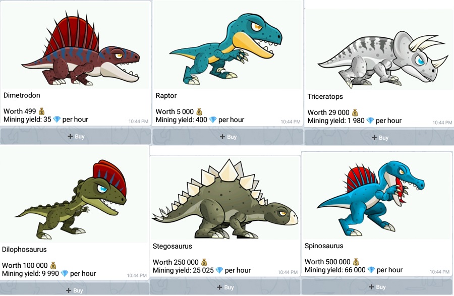 মোট ৬ ধরনের ডায়নোসোর আছে। প্রত্যেকটার নিচে দাম এবং প্রতি ঘন্টায় কতোগুলো ডায়মন্ড আয় করতে পারবে তা লেখা আছে।