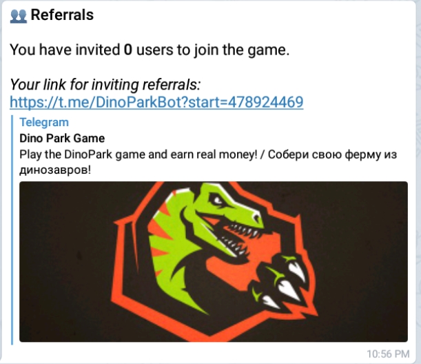 Referrals এ ক্লিক করুন। উপরের ছবির মতো একটা ইনভাইটেশন লিংক দেখতে পাবেন। ওই লিংক বন্ধুদের সাথে শেয়ার করুন, আপনার কোন বন্ধু ইনভাইটেশন লিংক থেকে ডিনো পার্ক গেম বট ব্যবহার করলে আপনি ২০০ কয়েন বোনাস পাবেন।